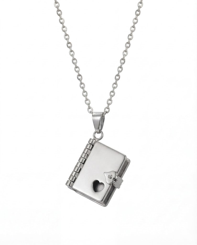 Nuestro collar en forma de libro es una pieza única diseñada para guardar tus recuerdos más importantes en un solo lugar.